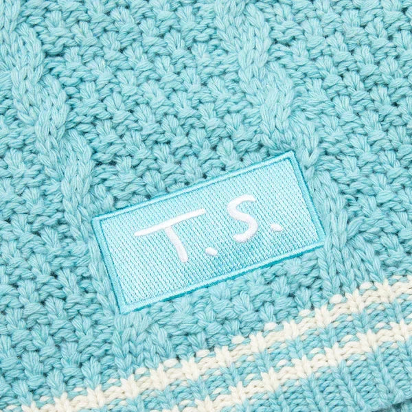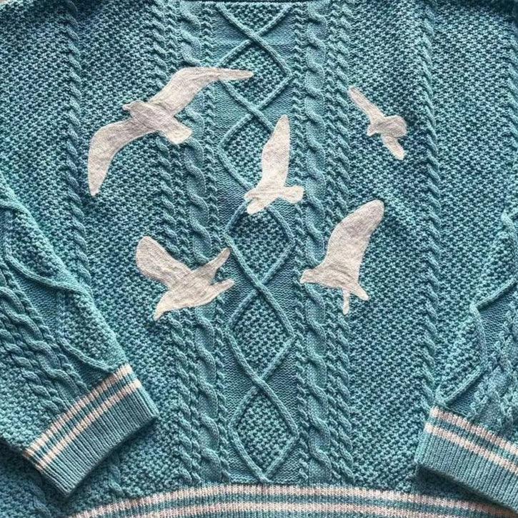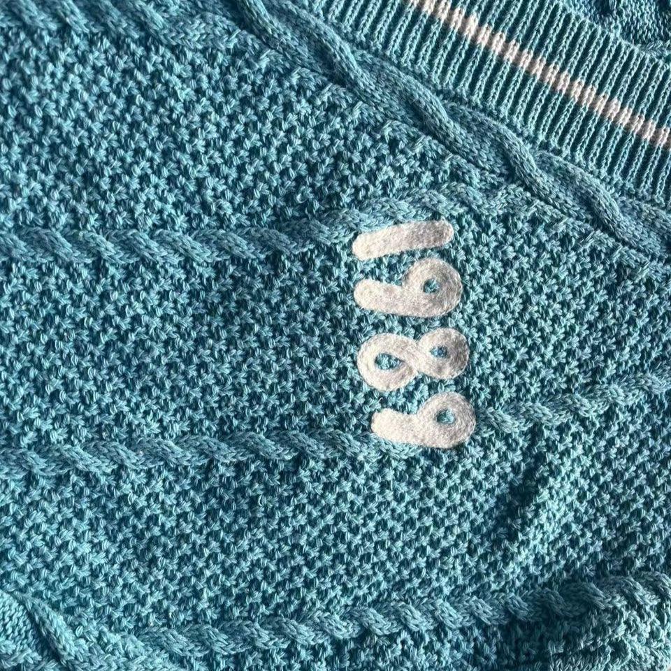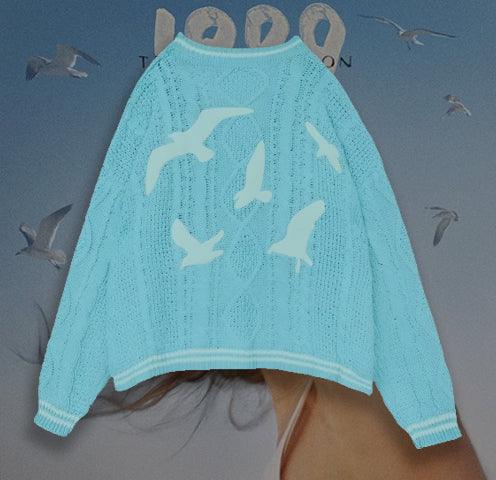 🌟 Cardigan Azul Celeste com Botões e Listras Creme 🤍✨, Enaltecendo '1989' Bordado no Peito Esquerdo. Um Distintivo 'T.S.' Costurado com Carinho na Bainha Esquerda e um Elegante Bordado de Gaivota 🌊🕊️ nas Costas, Transportando Você para o Mundo Mágico de '1989'.