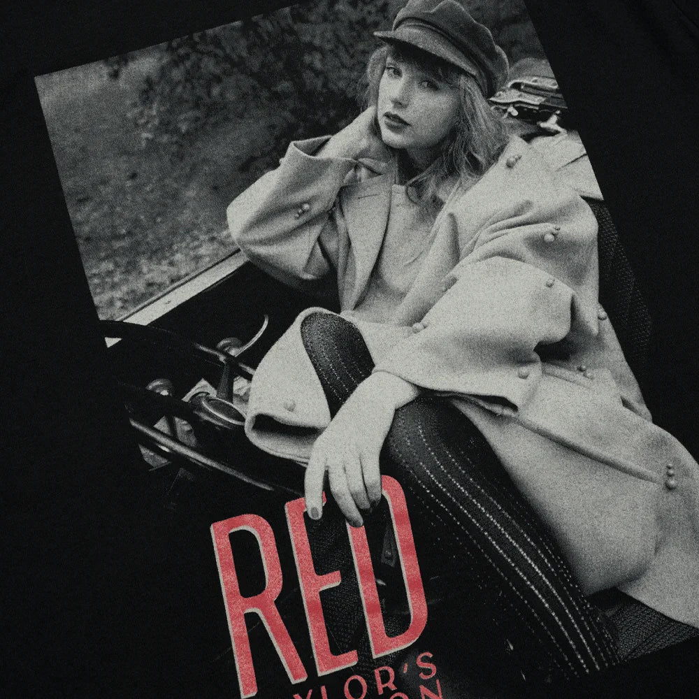 Camiseta preta com foto de Taylor Swift e "Red (Versão Taylor)" impresso na frente.