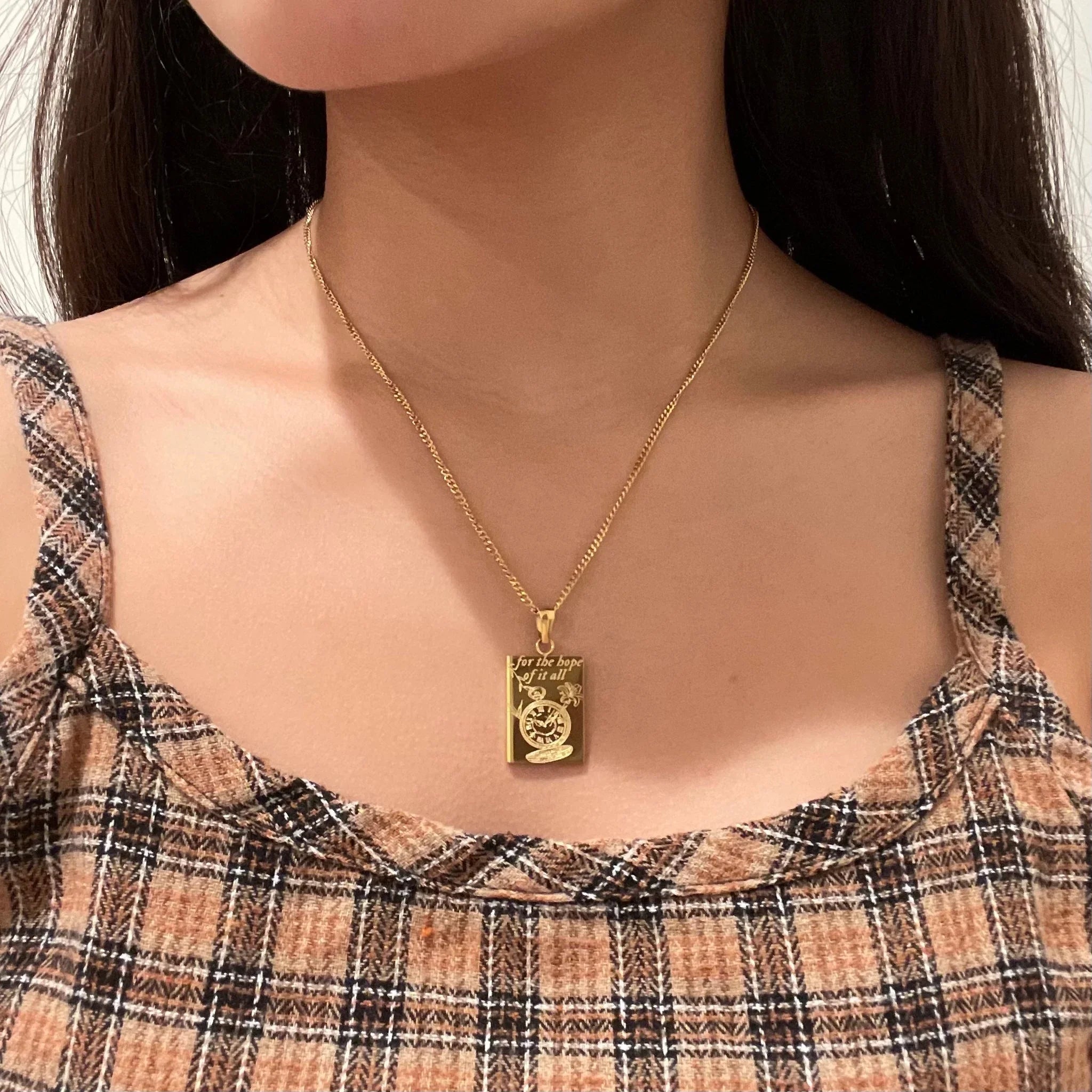 Este colar de aço inoxidável apresenta um pingente retangular com a frase 'for the hope of it all', destacando um relógio de bolso com estrela de oito pontas e lírios, símbolos de esperança. Disponível em prata e ouro, é perfeito para quem aprecia detalhes significativos e inspiradores. 🕊️✨