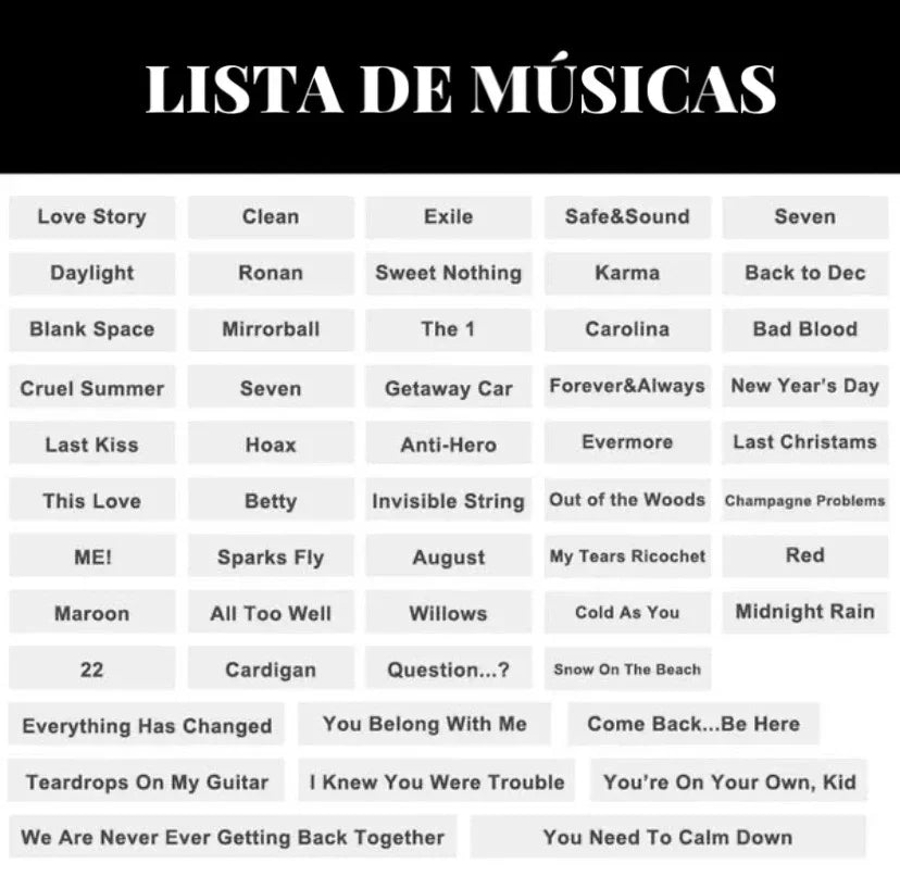 • Biblioteca de Músicas: Inclui uma seleção de músicas de todas as eras da carreira de Taylor Swift, desde "Fearless" até "Folklore" e além.